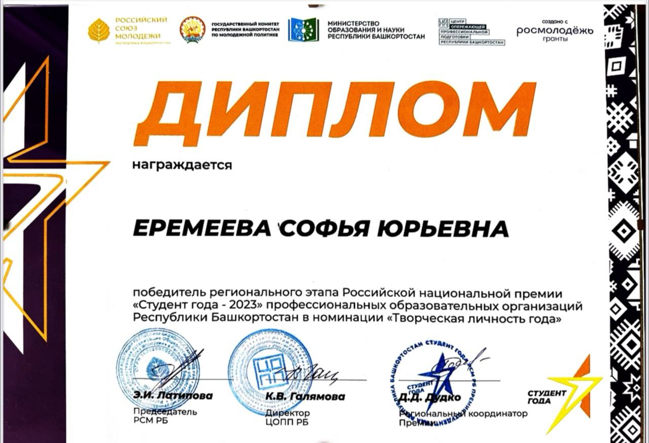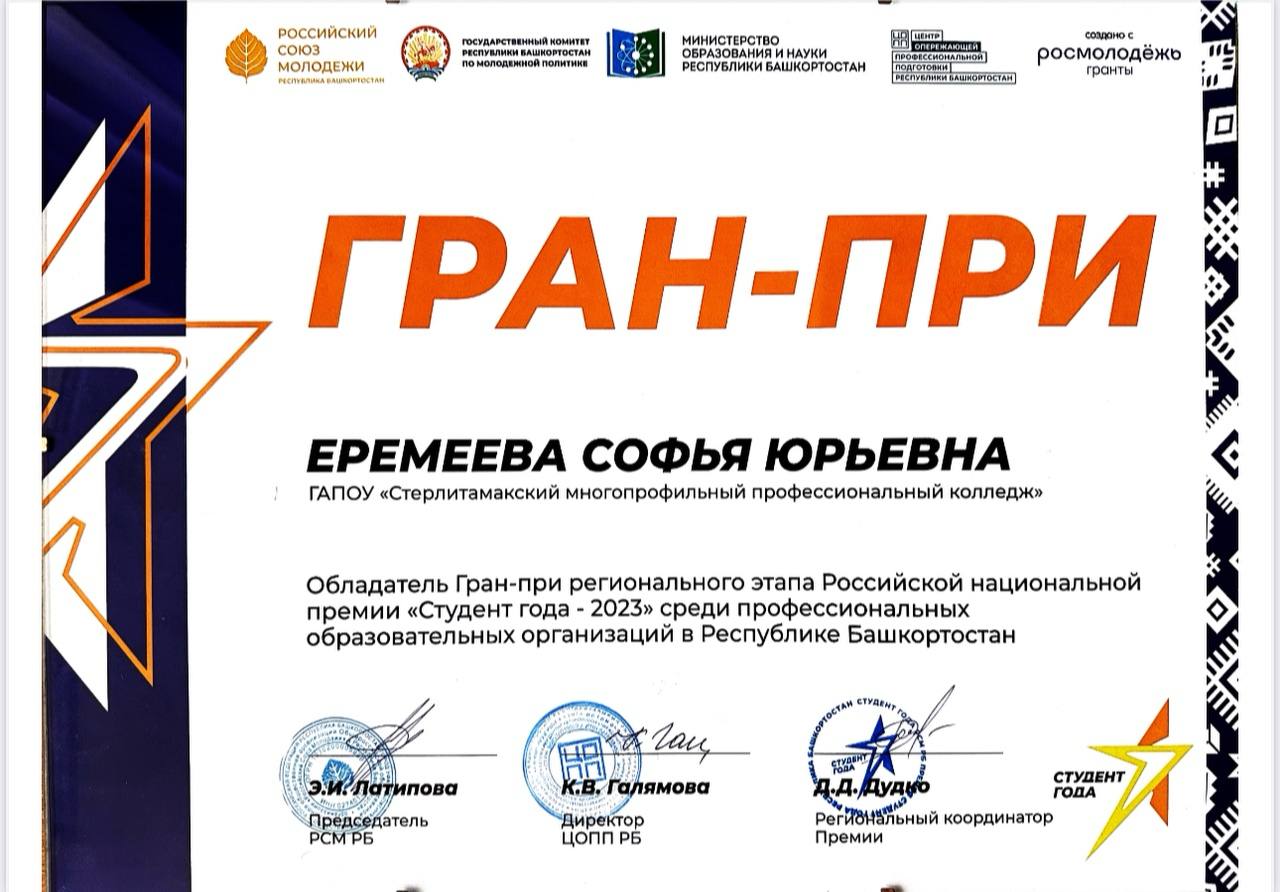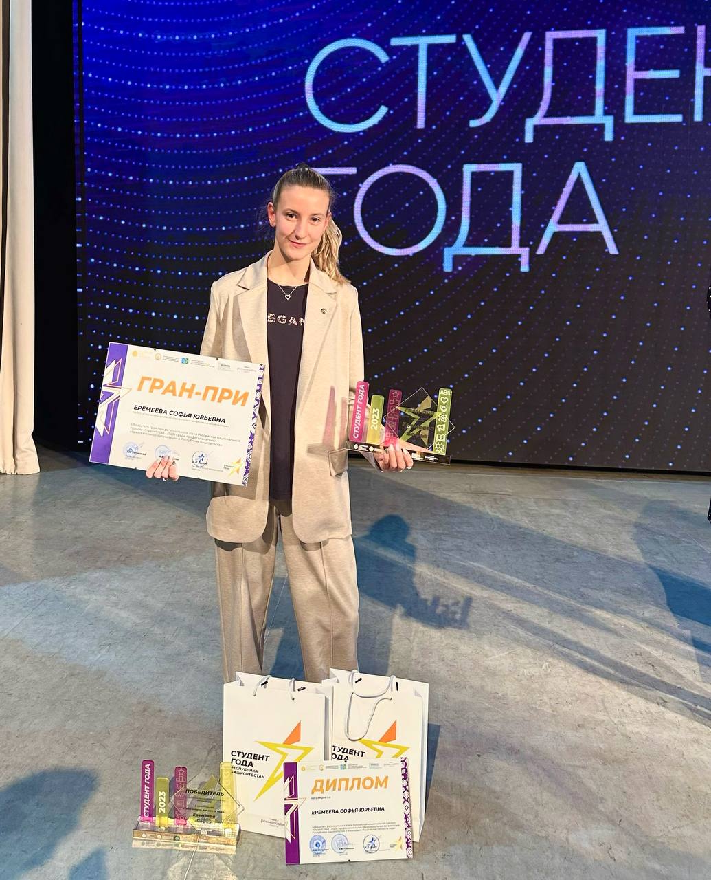 Также в 2023 году стала победителем всероссийского этапа Российской национальной премии "СТУДЕНТ ГОДА"
